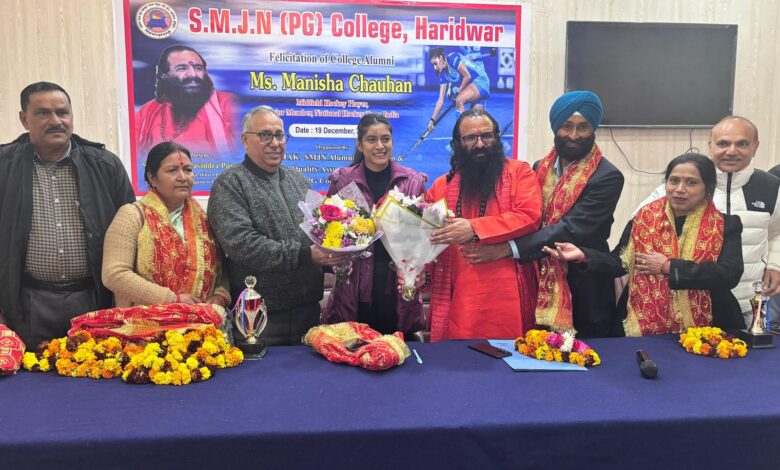 19 दिसंबर 2025। एस. एम. जे. एन. पी. जी. कॉलेज में भारतीय महिला हॉकी टीम की खिलाड़ी तथा महाविद्यालय की पूर्व छात्रा मनीषा चौहान का स्वागत तथा सम्मान समारोह हर्षोल्लास के साथ आयोजित किया गया। इस कार्यक्रम की अध्यक्षता कर रहे अखिल भारतीय अखाड़ा परिषद तथा कॉलेज प्रबंध समिति के अध्यक्ष श्री महंत रविन्द्र पुरी महाराज ने पूर्व छात्रा मनीषा चौहान को आशीर्वाद देते हुए कहा कि आज आयोजित यह सम्मान कार्यक्रम गौरवमयी पल हैं। श्रीमहंत ने कहा कि मनीषा चौहान की लगन और परिश्रम ने हरिद्वार का नाम सम्पूर्ण विश्व में रोशन किया हैं। उन्होंने कहा कि अनुशासन, संयमित व्यवहार और परिश्रम की निरंतरता ने ही मनीषा चौहान को यूथ आइकॉन बनाया हैं।