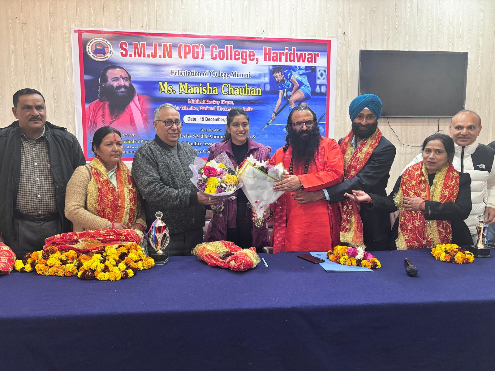 19 दिसंबर 2025। एस. एम. जे. एन. पी. जी. कॉलेज में भारतीय महिला हॉकी टीम की खिलाड़ी तथा महाविद्यालय की पूर्व छात्रा मनीषा चौहान का स्वागत तथा सम्मान समारोह हर्षोल्लास के साथ आयोजित किया गया। इस कार्यक्रम की अध्यक्षता कर रहे अखिल भारतीय अखाड़ा परिषद तथा कॉलेज प्रबंध समिति के अध्यक्ष श्री महंत रविन्द्र पुरी महाराज ने पूर्व छात्रा मनीषा चौहान को आशीर्वाद देते हुए कहा कि आज आयोजित यह सम्मान कार्यक्रम गौरवमयी पल हैं। श्रीमहंत ने कहा कि मनीषा चौहान की लगन और परिश्रम ने हरिद्वार का नाम सम्पूर्ण विश्व में रोशन किया हैं। उन्होंने कहा कि अनुशासन, संयमित व्यवहार और परिश्रम की निरंतरता ने ही मनीषा चौहान को यूथ आइकॉन बनाया हैं।