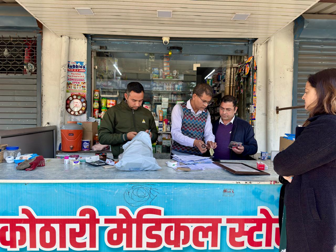 एम०एस० मेडिकल हॉल, नेहरूग्राम, देहरादून – संस्था के प्रो० एवं फॉर्मासिस्ट संजय कुमार उपस्थित पाये गए। फ्रिज में तापमान डिस्प्ले पाया गया और 04 सी०सी०टी०वी० कैमरे भी पाये गए। एक्सपायर दवाईयों का स्टोरेज भी व्यवस्थित रूप से पाया गया। कुछ ही दवाईयां एक्सपायर मिली। बताया गया कि नारकोटिक्स दवाईयों का विक्रय कम किया जाता है। निरीक्षण टीम द्वारा स्टोर में साफ-सफाई रखने के साथ लॉइसेन्स की शर्तों का पालन करने के निर्देश दिये गए।
