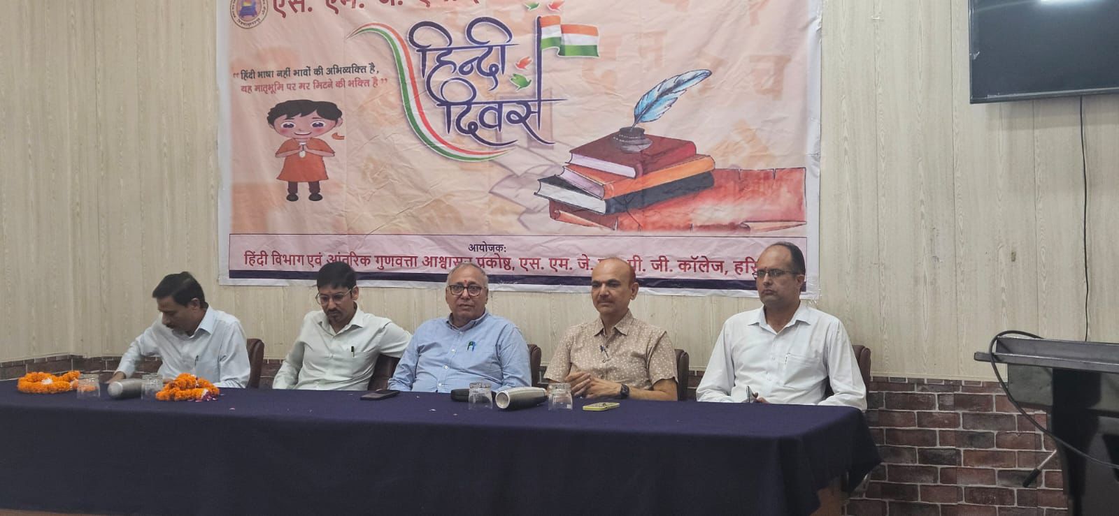 हरिद्वार। एस एम जे एन (पीजी )कॉलेज में हिंदी विभाग तथा आंतरिक गुणवत्ता आश्वासन प्रकोष्ठ द्वारा हिंदी उत्सव कार्यक्रम का आयोजन किया गया। कार्यक्रम की शुरुआत मां सरस्वती वंदना से की गई । कार्यक्रम की रूपरेखा समझते हुए हिंदी विभाग की प्राध्यापिका डॉ लता शर्मा ने हिंदी भाषा के उद्भव और विकास पर प्रकाश डाला । बी एस सी की छात्रा सोनाली ने माँ दुर्गा सप्तशती से मां दुर्गा की स्तुति की जबकि बी एस सी के छात्र दिव्यांशु नेगी ने नशे के दुष्प्रभाव पर हिंदी भाषा में कविता का पाठ किया। बी एस सी की छात्रा ईशा कश्यप एवं बी कॉम के छात्र अंश कुमार ने हिंदी के महत्व को दिखाते हुए कविता प्रस्तुत की। इसी क्रम में दीक्षा यादव ने सोहनलाल द्विवेदी की कविता” पर्वत कहता शीश उठाकर “की सुंदर प्रस्तुति दी । हिंदी विभाग की डॉ रेनू सिंह ने कबीर और रहीम के दोहों की मधुर प्रस्तुति के साथ कार्यक्रम को मनमोहक बना दिया। राजनीति विभाग के विभागाध्यक्ष प्रो विनय थपलियाल ने संयुक्त राष्ट्र संघ में पहली बार हिंदी में उद्बबोधन पर महत्वपूर्ण जानकारी दी। इसके पश्चात बी ए के छात्र शांतनु ने तबले की संगत पर सूरदास के पदों का गायन किया।